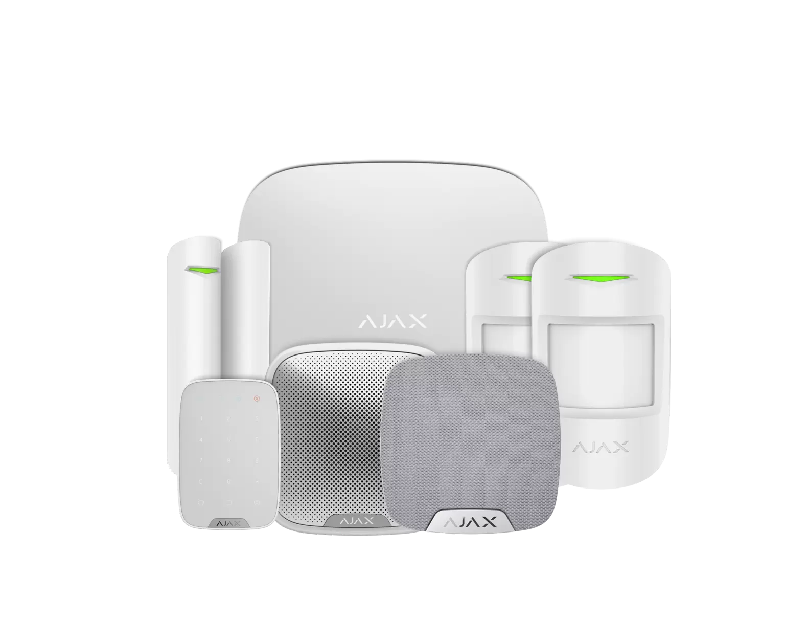 The Kit 5 features Ajax Hub 2 (supports all AJAX devices including motion cams + 32 Scenarios), 2x MotionProtect S, 1 x DoorProtect S, 1 x SKeypad Plus (Supports Tags), StreetSiren and HomeSiren S.