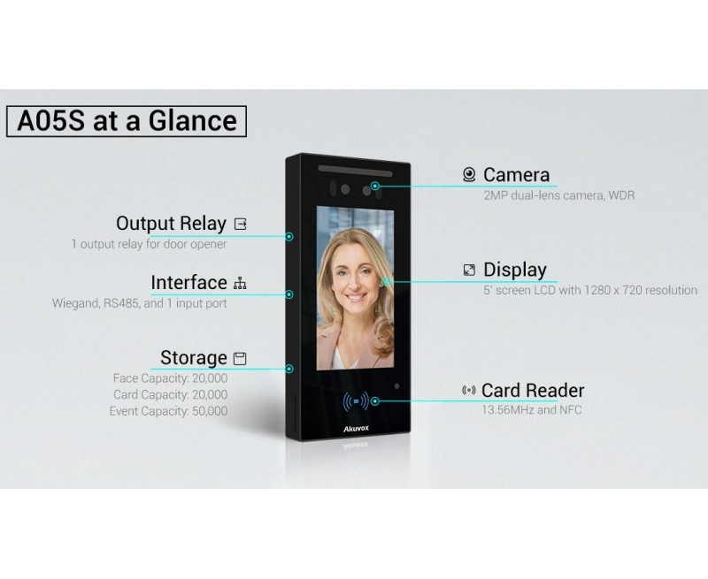 Using the latest deep-learning AI and dual-camera technology, the Akuvox A05C Access Unit allows secure, touch-free verification via face recognition, Bluetooth, RFID or QR Code scanning, supported by the Akuvox SmartPlus smartphone app.