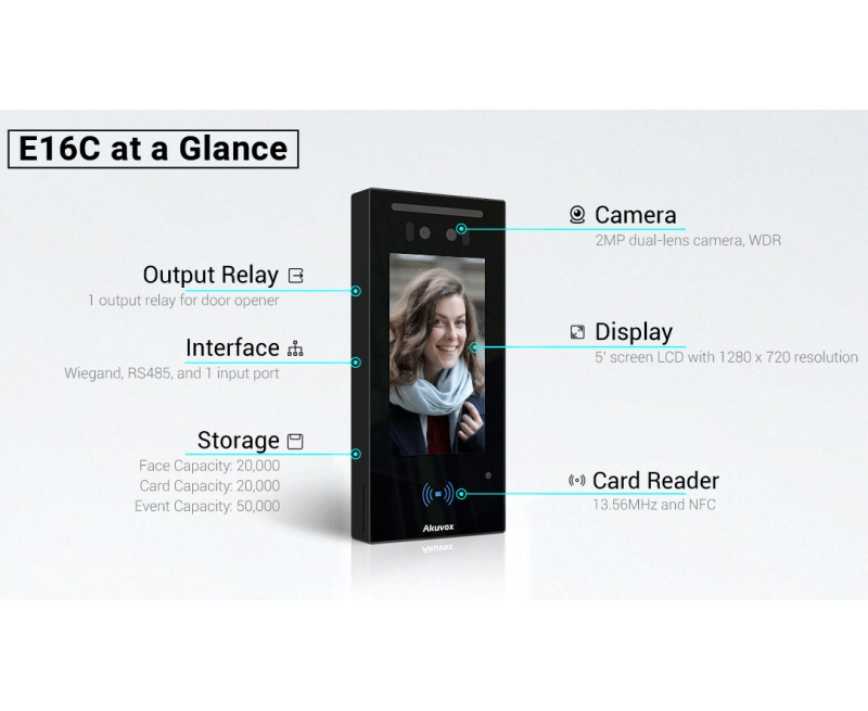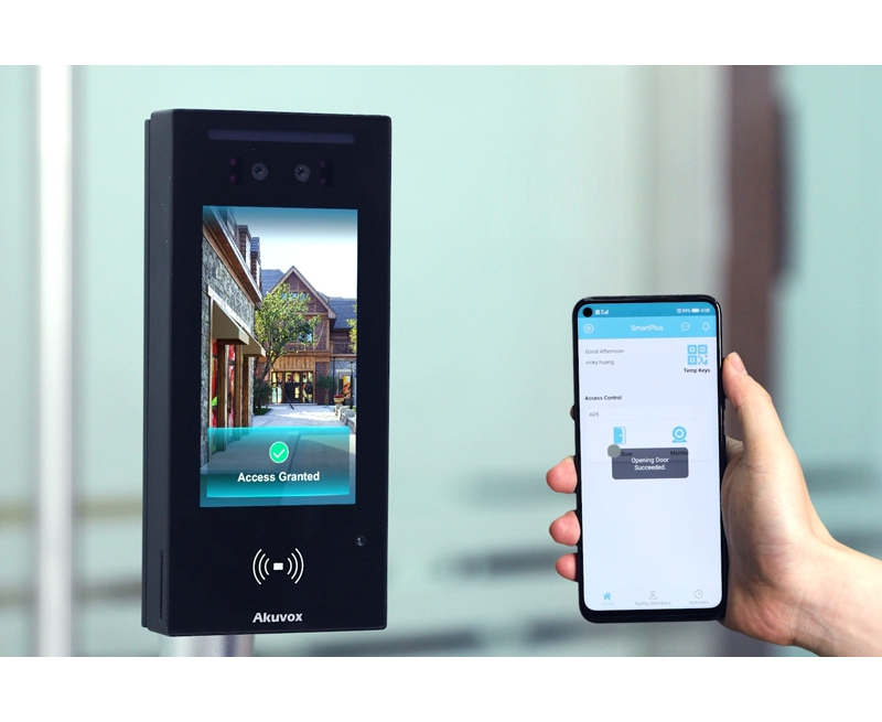 Using the latest deep-learning AI and dual-camera technology, the Akuvox E16C Access Unit allows secure, touch-free verification via face recognition (including mask detection), Bluetooth BLE, RFID and QR Code scanning, supported by the Akuvox SmartPlus smartphone app.