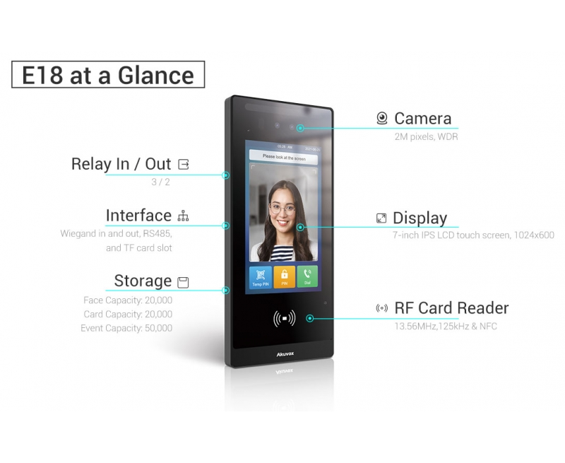 Akuvox - E18C IP Access Control Unit & SIP Intercom, Touchscreen, Face Recognition, Bluetooth, RFID & QR Code