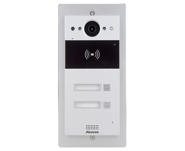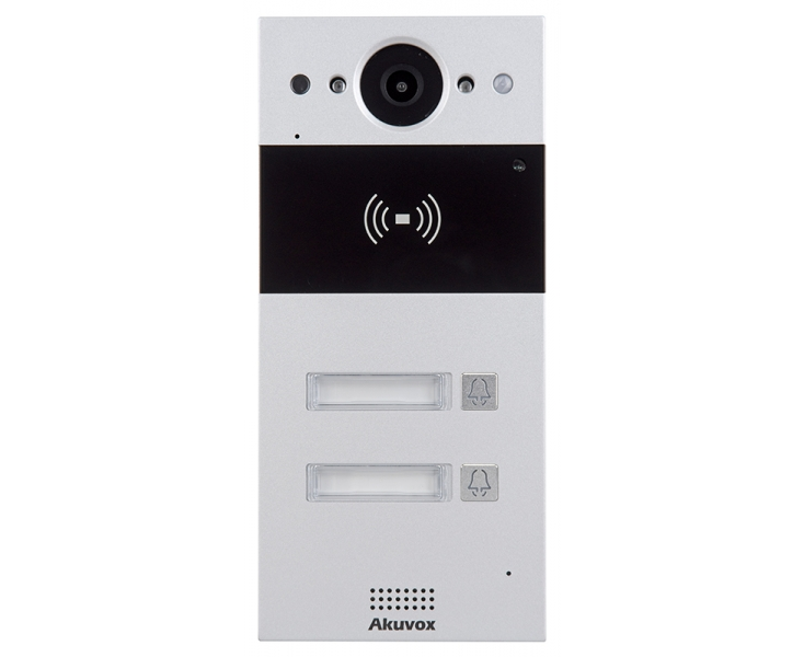 The Akuvox R20B2F is a highly-compact, IP-connected Door Intercom. It features 2 Call Buttons with Nameplates, high resolution colour camera, RFID card reader and NFC contactless via smart phone for secure remote audio/video communication and door entry.