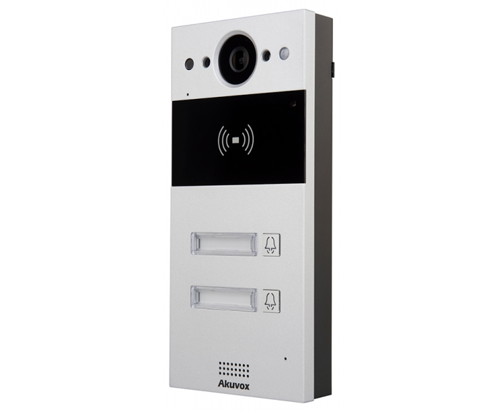 The Akuvox R20B2S is a highly-compact, IP-connected Door Intercom. It features 2 Call Buttons with Nameplates, high resolution colour camera, RFID card reader and NFC contactless via smart phone for secure remote audio/video communication and door entry.