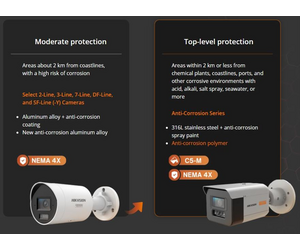 Corrosion from salt spray is a real problem even a few Km back from coastlines. Hikvison have addressed this with a number of products with varying protection levels.