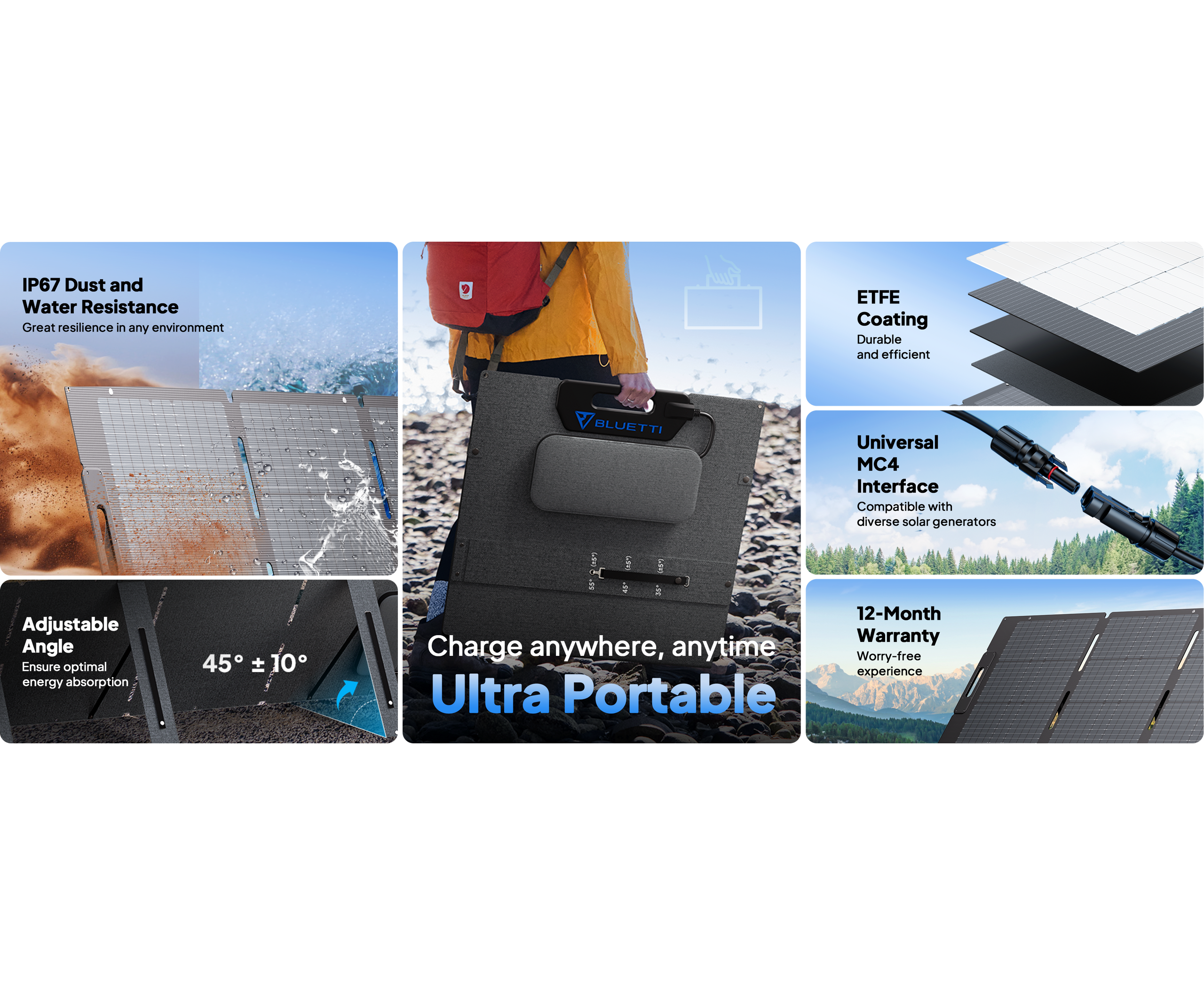 Introducing the BLUETTI PV200D Portable Solar Panel, your ultimate companion for off-grid adventures and sustainable energy solutions. Harness the power of the sun with its impressive 200W solar capacity and up to 23.4% conversion rate, enabling efficient charging of your solar generators while minimizing environmental impact.Whether you're camping in the wilderness, exploring the great outdoors, or preparing for emergencies with limited access to electricity, the BLUETTI PV200D ensures you stay powered up wherever you go!