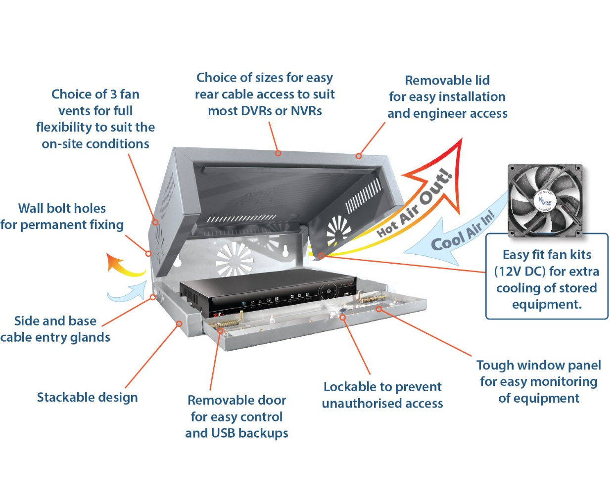 Great for small DVRs/NVRs of up to 4-8 channels but with enough space surrounding it to allow for the addition of up to 3 cooling fans to keep your CCTV equipment cool, especially handy in enclosed spaces.