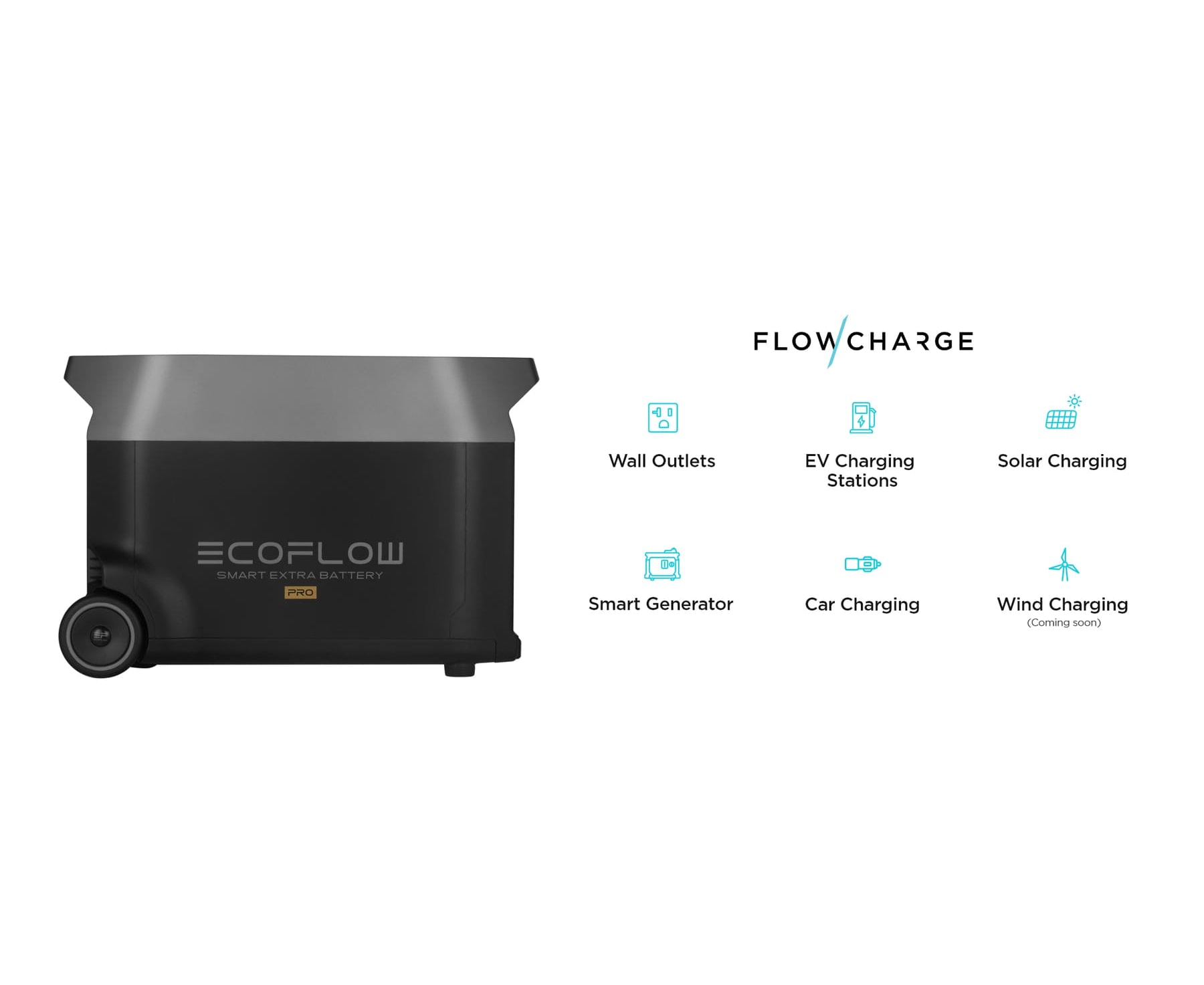 Convenient recharging Recharging from solar panels, AC outlets, EV charging stations, or our Smart Generator is easy. Plug the Extra Battery into DELTA Pro and they will recharge and discharge in tandem.
