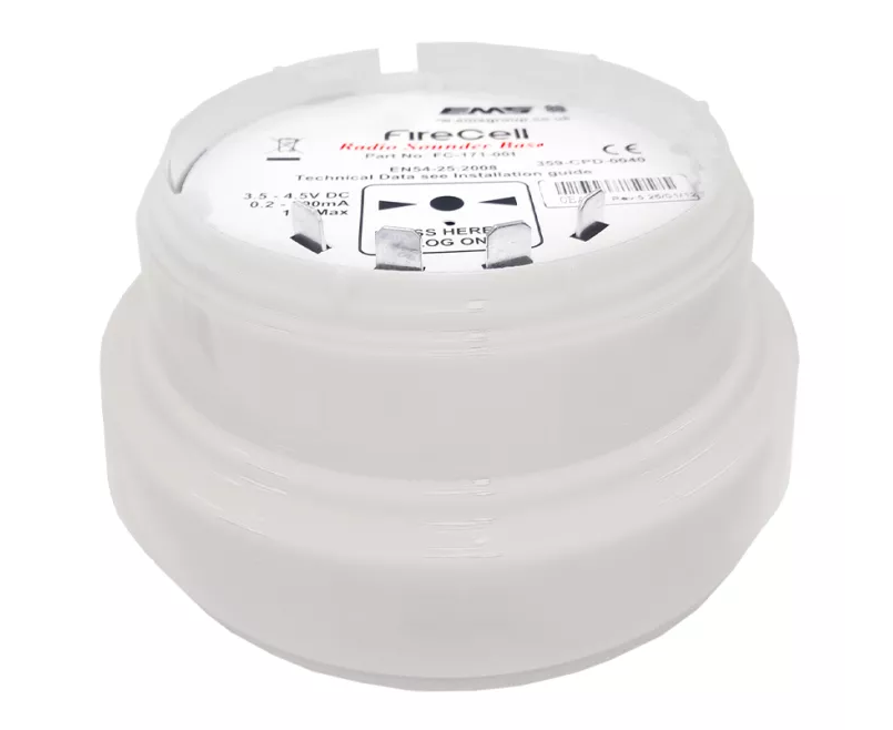 The EMS FireCell FC-171-001 is a white Wireless Sounder Base designed for compatibility with the FireCell range of wall mounted sounder heads and sounder / beacon heads.