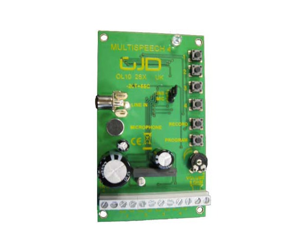 The Multispeech is a four-channel speech enunciator module designed for intruder monitoring, access control, welcoming, advising or warning. A different 30 second message can be recorded on each of the four channels or alternatively one single message of 120 seconds long can be recorded.