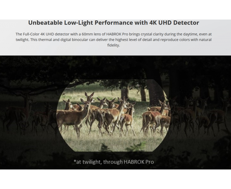 With the press of the button the Habrok switches to its 4K Day & Night camera to deliver a bright, vibrant, full colour image in daylight that allows you to view your surroundings in mind blowing detail. As twilight sets in and the ambient light drops the Habrok continues to shine with unparalleled light gathering capacity. The built in IR torch will activate in total darkness and the camera continues to deliver a high resolution, black and white image. New for the Habrok Pro is image stabilisation to minimise hand shake when observing at high magnification.