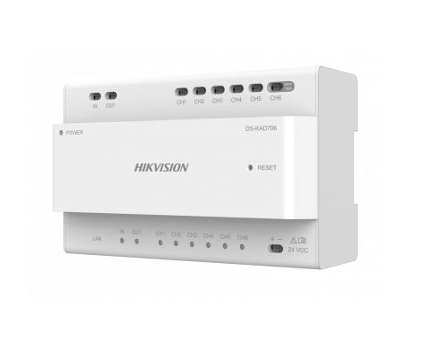 The DS-KAD706Y is a two-wire IP distributor, from Hikvision, designed with 6 two-wire cascade interfaces, 8 interface indicators, 1 RJ-45 interface, 1 reset button, and support for din-rail mounting.