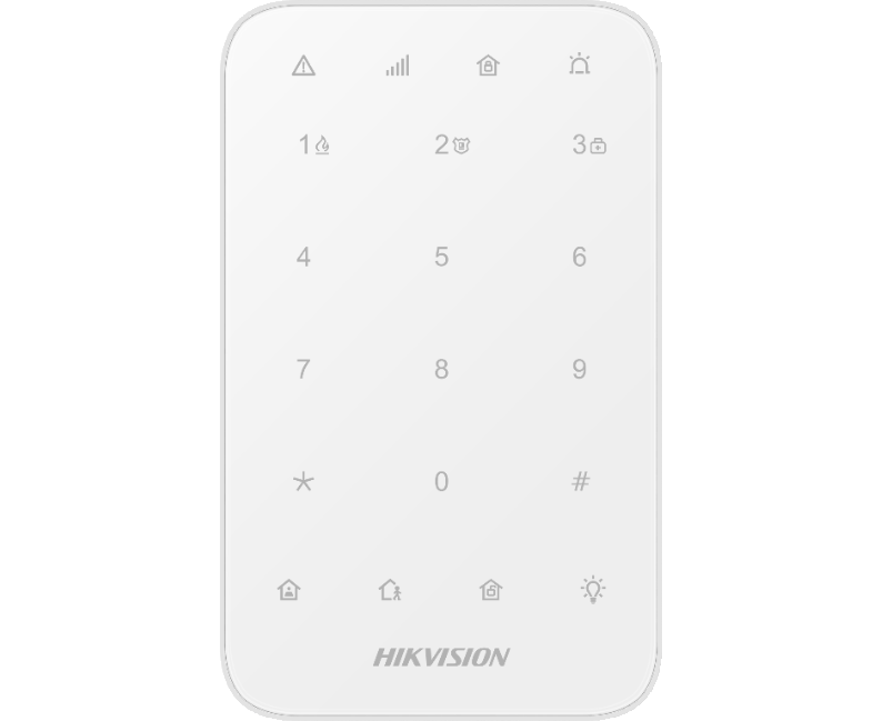 The DS-PK1-E-WE series wireless keypad can connect to AX PRO for alarm control and operation. It can also notice alarm by indicator and buzzer.