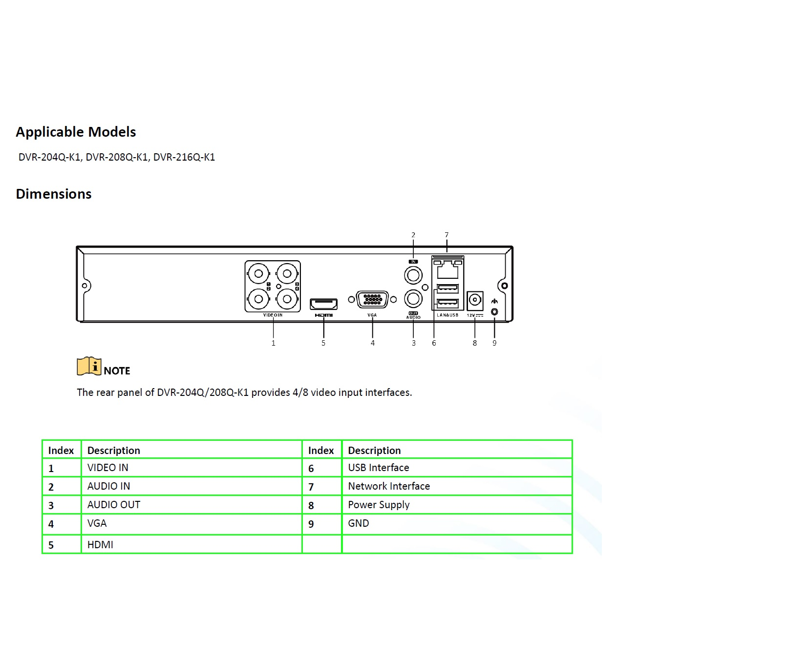 l 1 RJ45 10M/100M Ethernet network interface for DVR-204Q/208Q-K1, and 1 RJ45 10M/100M/1000M Ethernet network interface for DVR-216Q-K1