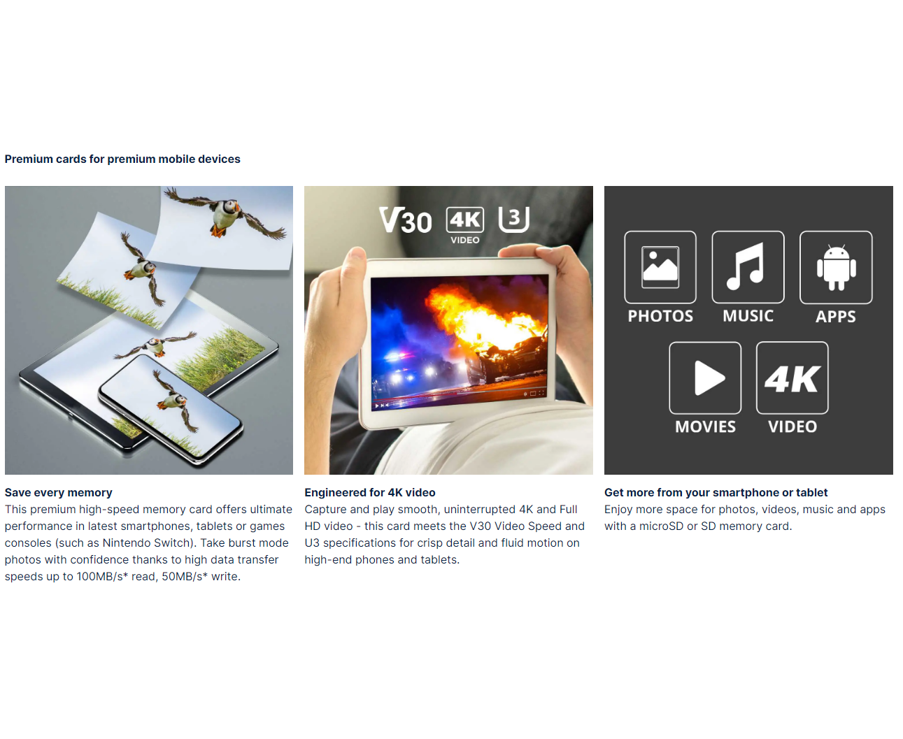 - Ideal for use in compatible smartphones, tablets, digital cameras, action cams, drones and game consoles