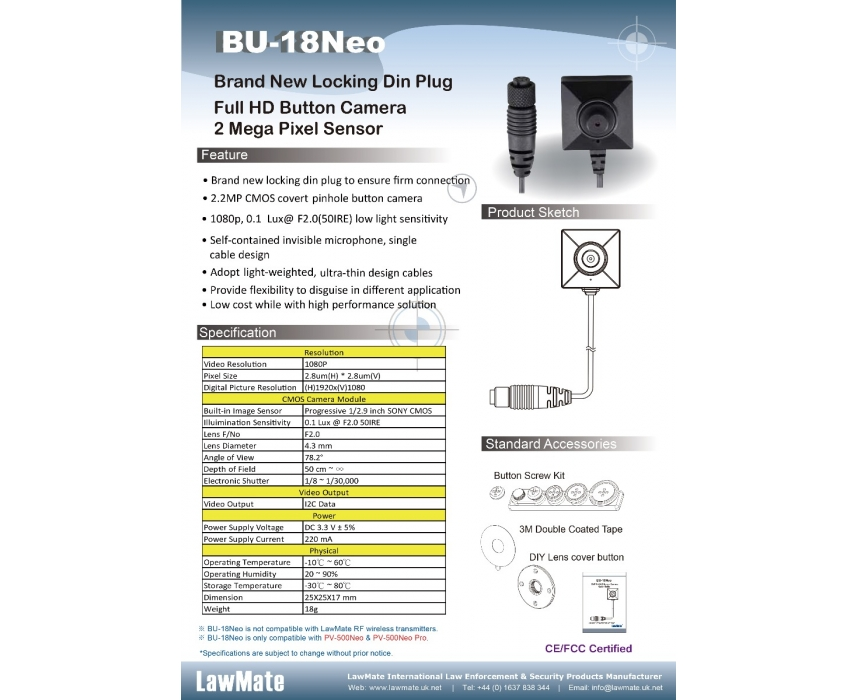The LawMate CM-BU18HD Neo is a 1080p digital camera providing exceptional full HD image quality with superb low-light sensitivity.