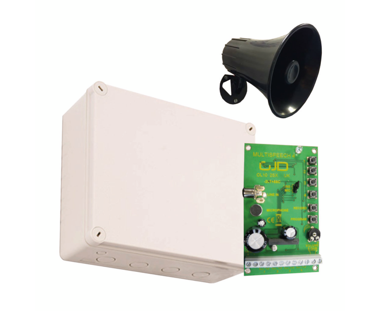 The Multispeech Kit is a four-channel speech enunciator module which includes an 8ohm Hornspeaker designed for intruder monitoring, access control, welcoming, advising or warning. A different 30 second message can be recorded on each of the four channels or alternatively one single message of 120 seconds long can be recorded.