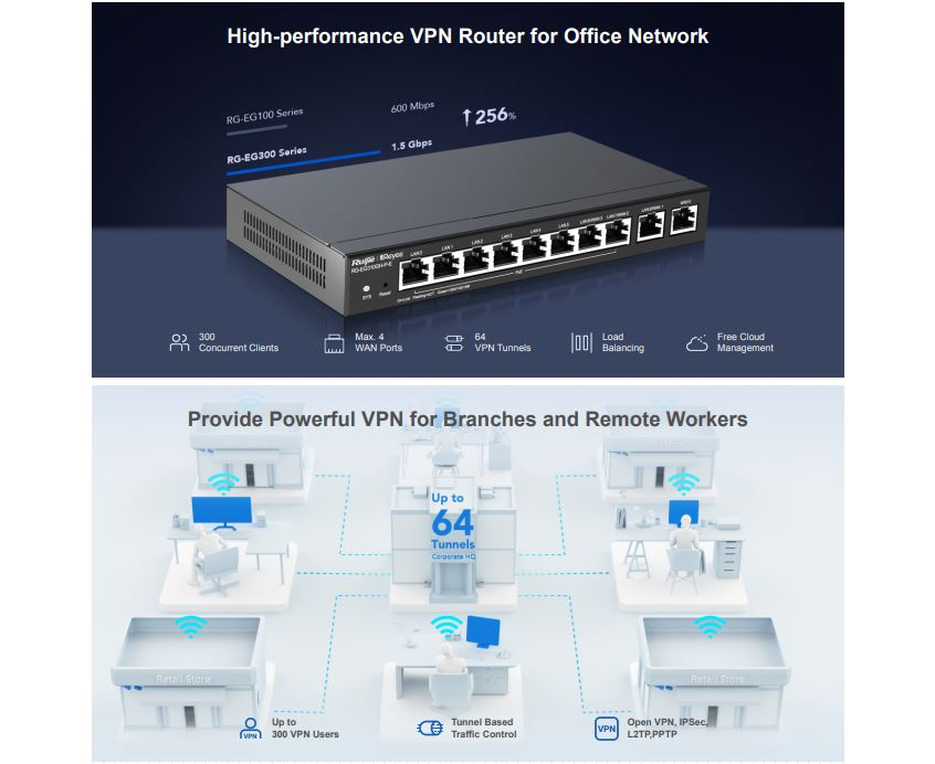 The Ruijie Reyee RG-EG310GH-P-E PoE Router with Cloud Management is a high-performance 1.5Gbps VPN router for the office network. Provide a powerful VPN for branch offices and remote workers. Provide traffic visualization monitoring, all in one place. A new efficient way to manage bandwidth on a per-application and per-user basis. Unbreakable WAN network, intelligent load balancing.