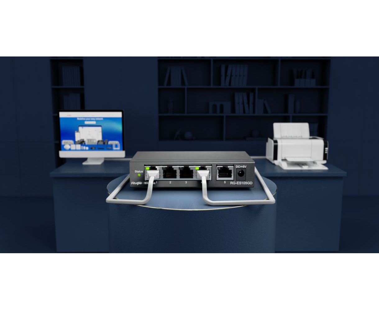 Ruijie Real-easy series RG-ES105D is a cost-effective unmanaged switch with metal casing designed for SMEs. The RG-ES100 Series supports plug-and-play without requiring any configuration, which can meet the requirements of various scenarios such as wired, wireless and surveillance networks.