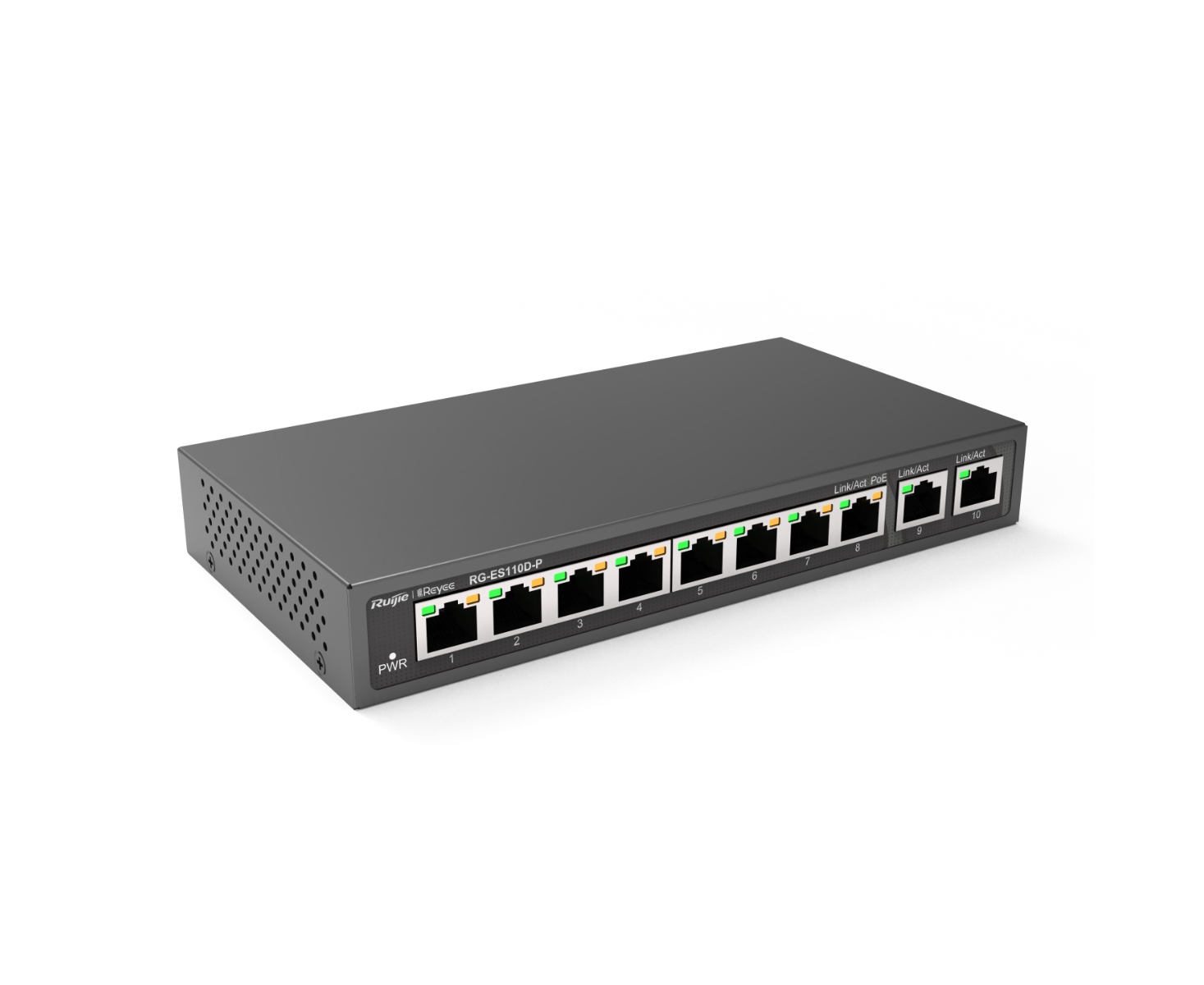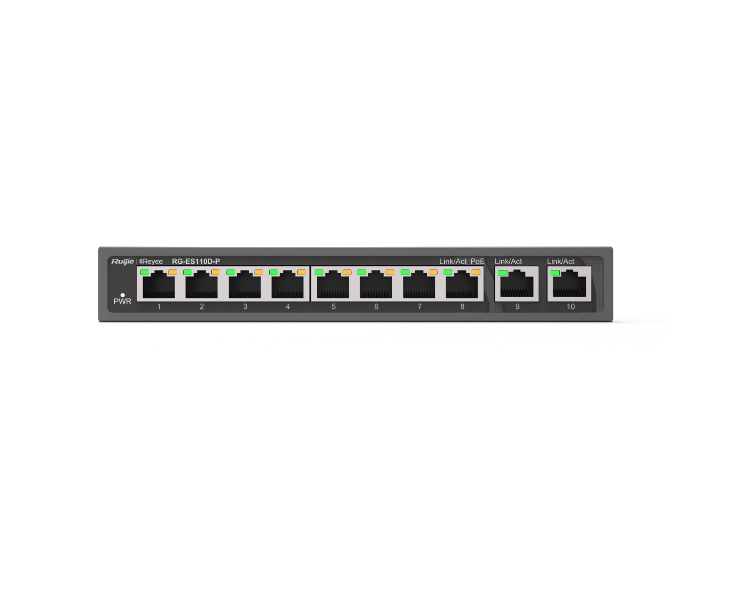 The Ruijie-Reyee RG-ES110D-P is an 8-Port Unmanaged PoE Switch that offers 8x 10/100Mbps Downlink Ports with PoE/PoE+ power supply, 2x 1000Mbps Uplink Ports and 110W Max PoE power budget. Video surveillance has been widely popularized, and more and higher requirements are raised for surveillance security switches that are indispensable for video data transmission. Ruijie-Reyee launches the RG-ES100 Series of Unmanaged Switches to provide customers with next-generation unmanaged surveillance security switches that feature diversified specifications, stable quality, and high-cost performance. The RG-ES100 Series supports diversified product forms like desktop or rack-mounting installation and 6 to 26 port PoE/non-PoE switches helping customers cope with the stringent requirements of different projects.