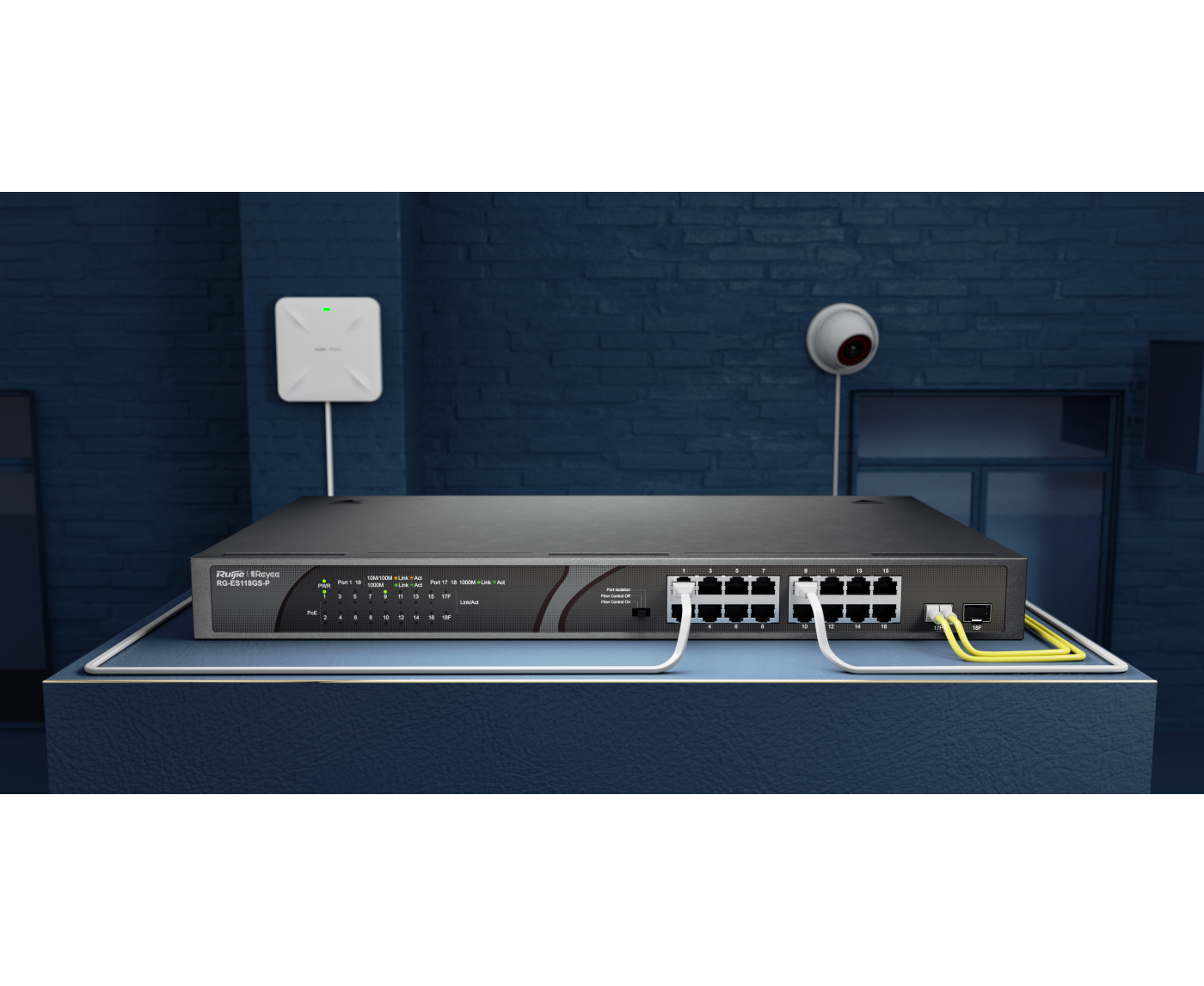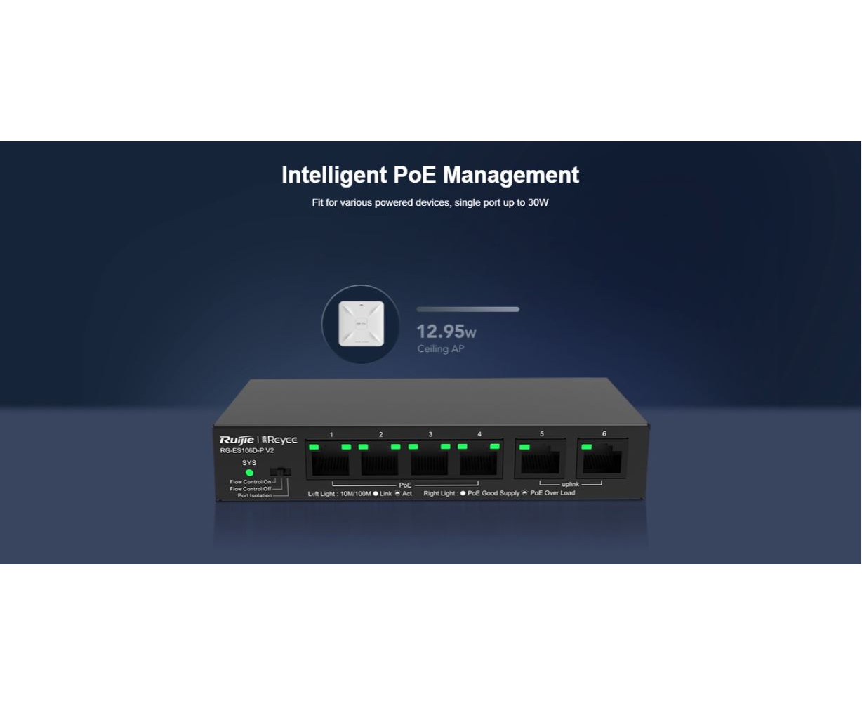 The Ruijie-Reyee RG-ES118GS-P is a 16-Port Gigabit unmanaged PoE/PoE+ switch with 2 Gigabit SFP uplink ports and 247W Max PoE power budget. Video surveillance has been widely popularized, and more and higher requirements are raised for surveillance security switches that are indispensable for video data transmission. Ruijie-Reyee launches the RG-ES100 Series of Unmanaged Switches to provide customers with next-generation unmanaged surveillance security switches that feature diversified specifications, stable quality, and high-cost performance. The RG-ES100 Series supports diversified product forms like desktop or rack-mounting installation and 6 to 26 port PoE/non-PoE switches helping customers cope with the stringent requirements of different projects.
