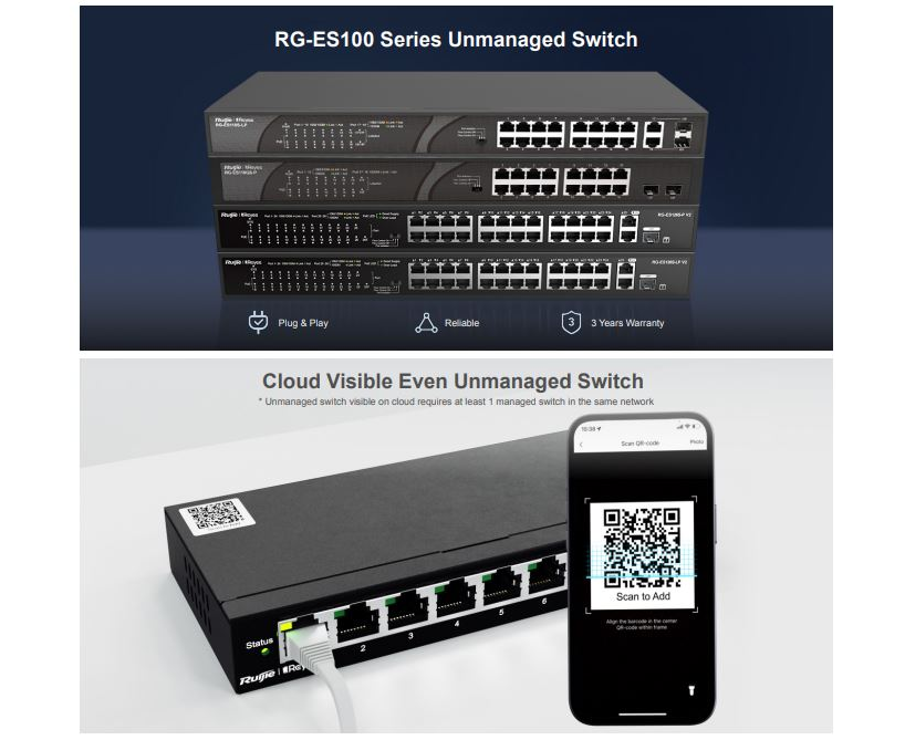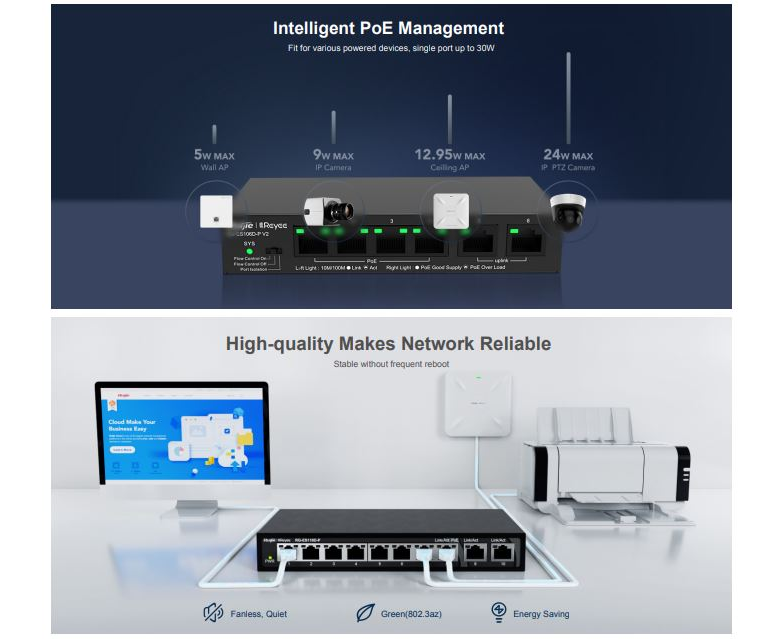 The Ruijie-Reyee RG-ES118S-LP is a 16-Port 100Mbps unmanaged PoE/PoE+ switch with 2 Gigabit RJ45/SFP combo uplink ports and 120W Max PoE power budget. Video surveillance has been widely popularized, and more and higher requirements are raised for surveillance security switches that are indispensable for video data transmission. Ruijie-Reyee launches the RG-ES100 Series of Unmanaged Switches to provide customers with next-generation unmanaged surveillance security switches that feature diversified specifications, stable quality, and high-cost performance. The RG-ES100 Series supports diversified product forms like desktop or rack-mounting installation and 6 to 26 port PoE/non-PoE switches helping customers cope with the stringent requirements of different projects.