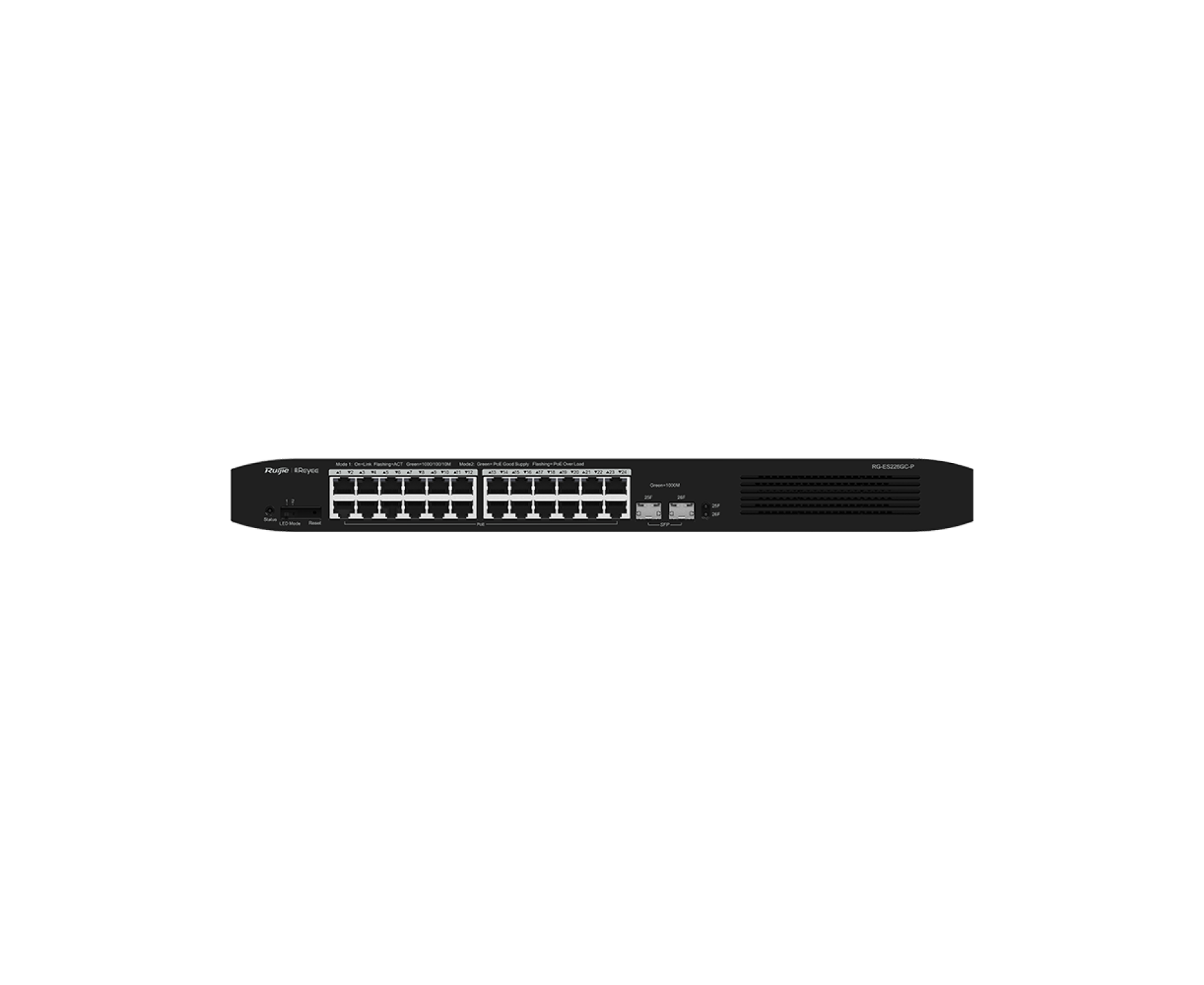 The Ruijie Reyee RG-ES226GC-P PoE switch has 24 PoE+ ports and has 2 SFP uplink ports.