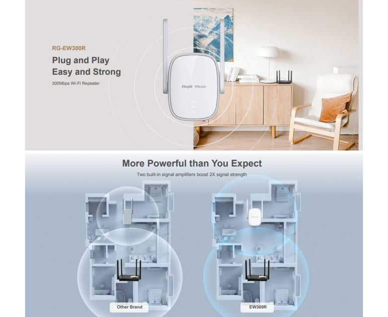 The Ruijie RG-EW300R is a simple solution to boost/extend Wifi, perfect for Home scenarios (small/medium sized homes). The plug and play configuration will allow minimal technical set-up and flexible placement with the One-click connection. by using WiFi Network Extenders around your home, you can shorten the distance between your WiFi devices and the WiFi signal thus increasing each device's speed and improving performance.