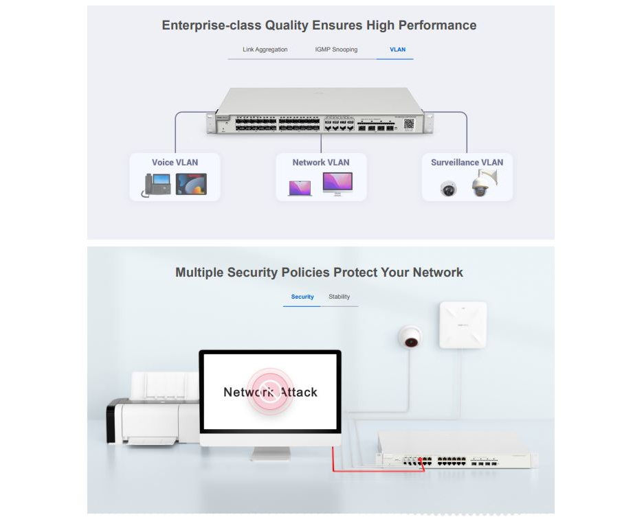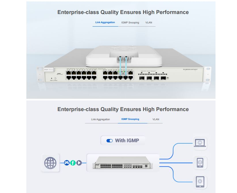 RG-NBS3200 series switches provide comprehensive end-to-end QoS as well as flexible and rich security settings for small and medium-sized networks at an extremely high price-performance ratio to meet the needs of high-speed, secure and smart enterprise networks.