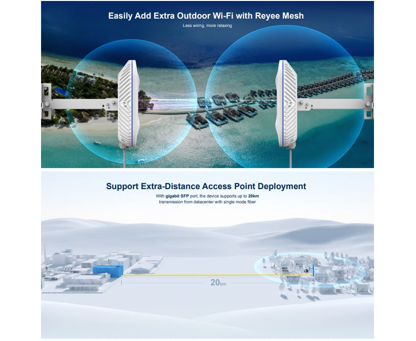 RG-RAP6260(G) supports Reyee Mesh, which allows users easily expand extra Wi-Fi in outdoor place. Less wiring, more relaxing.