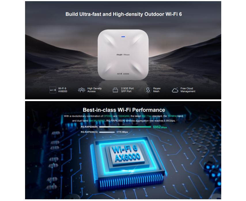 RG-RAP6260(H) is one of the wireless products fully developed by Ruijie Reyee. The device supports 802.3bt PoE In power supply. With concurrent 2.4GHz and 5GHz, the AP supports MU-MIMO technology, providing 1148Mbps at 2.4G, and 4804Mbps at 5G.
