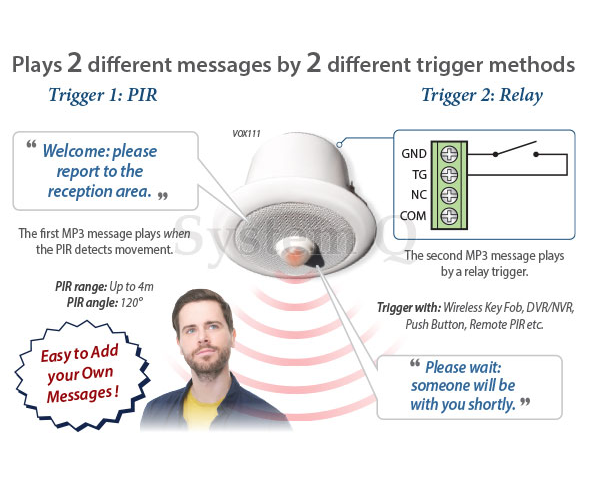 The VOX111 can also be triggered to play a different MP3 message by triggering its alarm input. This allows you to link it to others devices such as automatic doors, alarm panels, fire alarms etc. Inside the VOX111 it has the ability to store the two MP3 messages, one is played back from being triggered by the PIR, the second being trigged by something external connected to its alarm input.